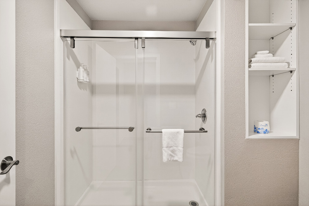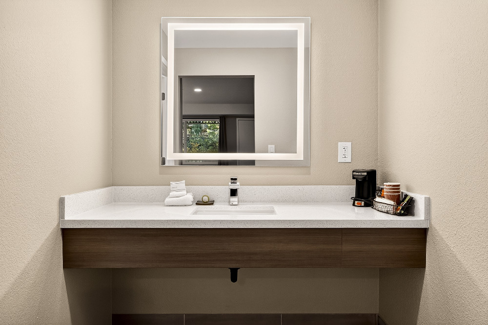 This room offers a division of space. There is a ¾ wall separating a queen bed from a sitting area, making this a great option for relaxation and entertaining. Rooms are located on the ground floor and the spacious bathrooms have a walk-in shower and a large closet. The wall mounted TV is ideal for watching your favorite show from bed or in the sitting area. These rooms have all the modern amenities such as Cable TV, Wi-Fi, Coffee Maker, Microwave, Mini Refrigerator, Heat & Air Conditioning, Iron & Ironing Board and FREE parking. This room type can accommodate up to 3 people *with a roll-away *for an additional fee and up to 2 pets*for an additional pet fee. ALL rooms are non-smoking and steps from hiking trails and outdoor adventures. If you like to be close to the fitness center and pool, then this is the room for you!